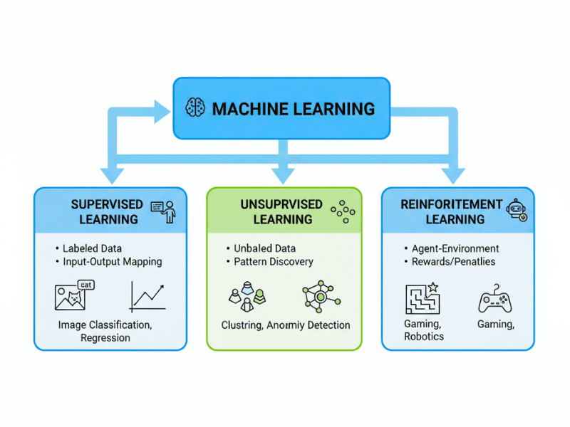 - Reinforcement Learning – Trial-and-error learning with incentive guidance (like teaching a dog tricks).